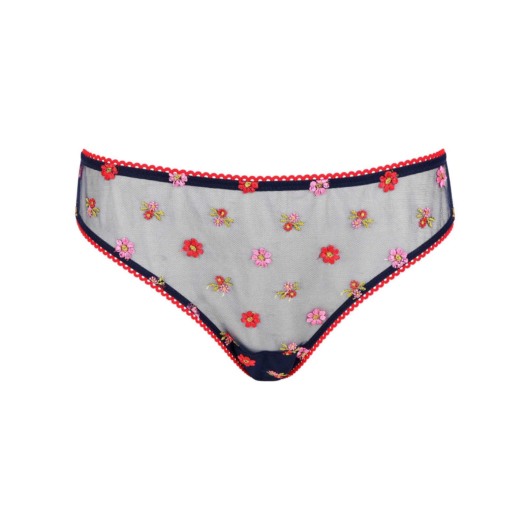 Découvrez la culotte Bisou, une pièce de lingerie qui marie à la perfection confort et sophistication. Entièrement brodée à l’avant et à l’arrière, elle dévoile un travail d’exception signé Union Maison Suisse, où la broderie florale s’entrelace sur un tulle bleu marine délicat pour sublimer les courbes avec finesse.
