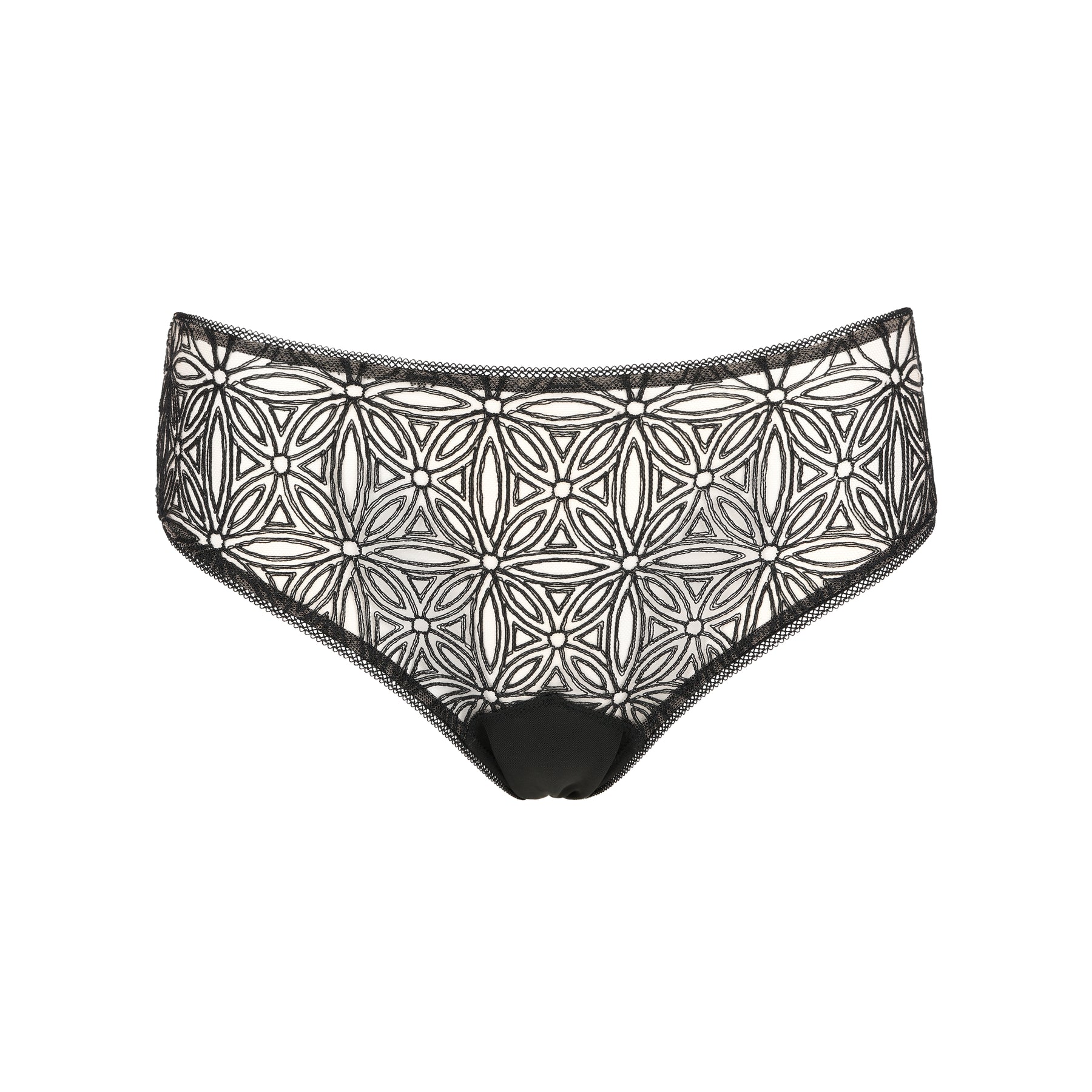 La Culotte Infini offre un mélange harmonieux d’élégance et de sensualité. Réalisée en broderie géométrique noire suisse, elle met en valeur la silhouette avec un style moderne et raffiné. Le devant présente un motif féminin et intemporel, tandis que l’ouverture au dos apporte une touche séduisante et contemporaine.
